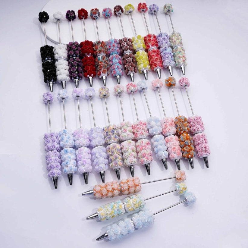 These beadable clay pens feature a vibrant mix of multi-color shiny soft flowers, AB rhinestones, and white pearls, offering a unique combination for detailed craft projects. The random assortment ensures each pen is distinct, perfect for adding intricate, eye-catching embellishments to your designs. Ideal for artists and crafters seeking to enhance their work with delicate textures and sparkling accents.