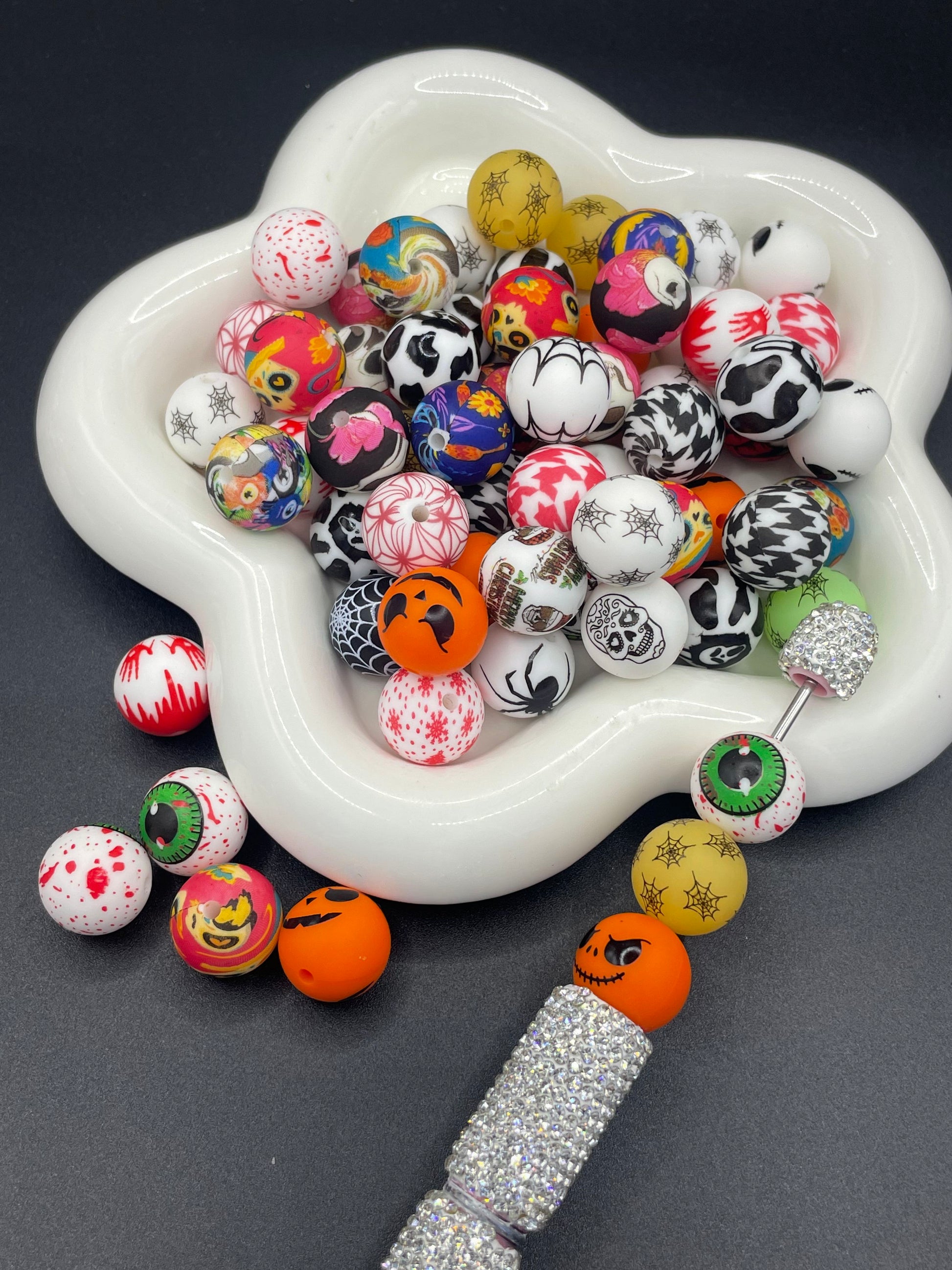 These Halloween limited edition silicone beads measure 15mm and feature a variety of printed designs mixed randomly. Crafted from durable, safe silicone, they are ideal for creating festive jewelry or crafts with a seasonal touch. Their vibrant prints and versatile size make them perfect for adding unique Halloween-themed accents to your projects.