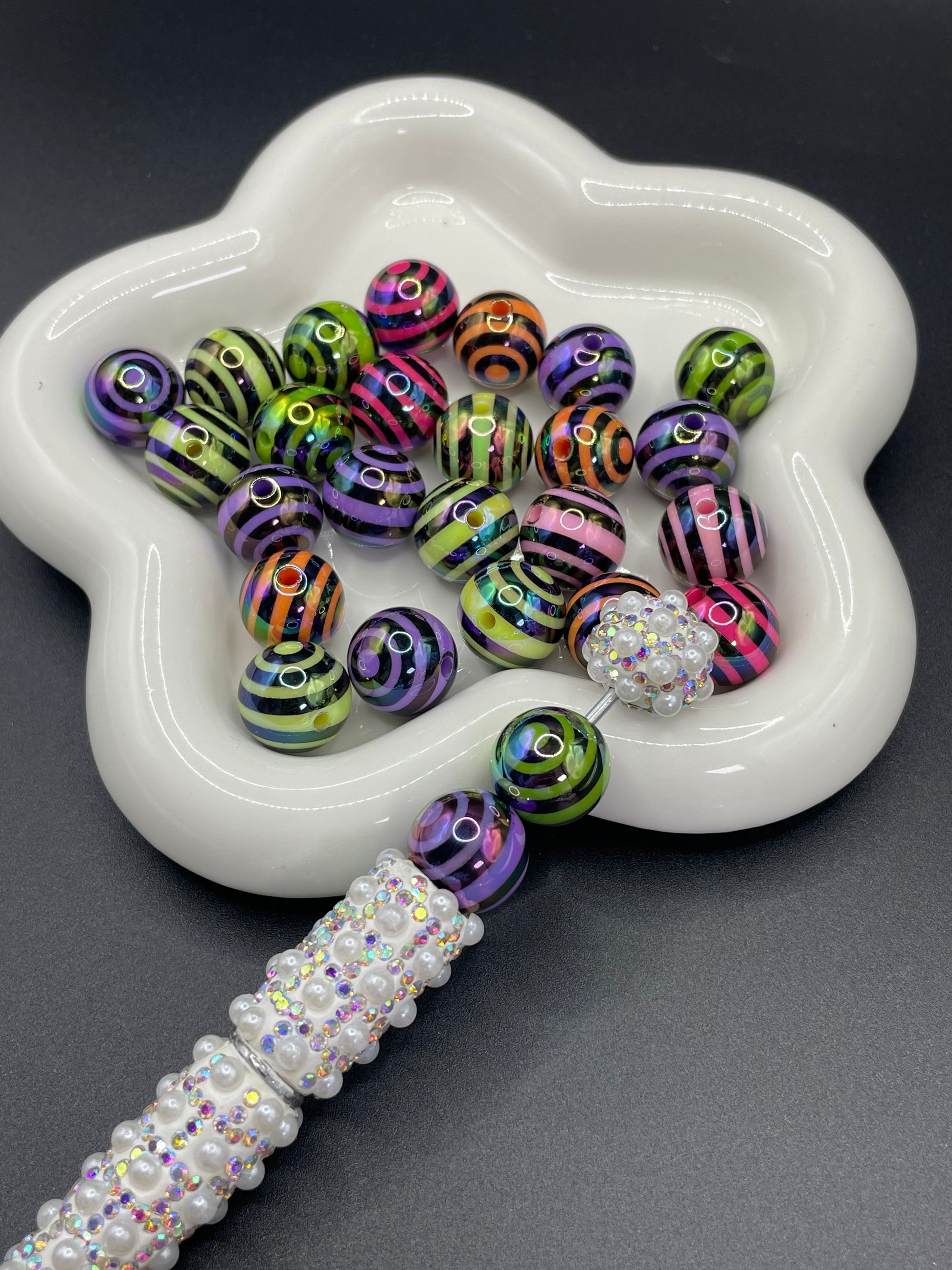These 16mm round acrylic beads feature a sleek black solid color with distinctive striped patterns enhanced by a durable UV coating. The coating ensures long-lasting color retention and surface protection, making them ideal for professional jewelry making and detailed craft projects requiring both style and resilience.